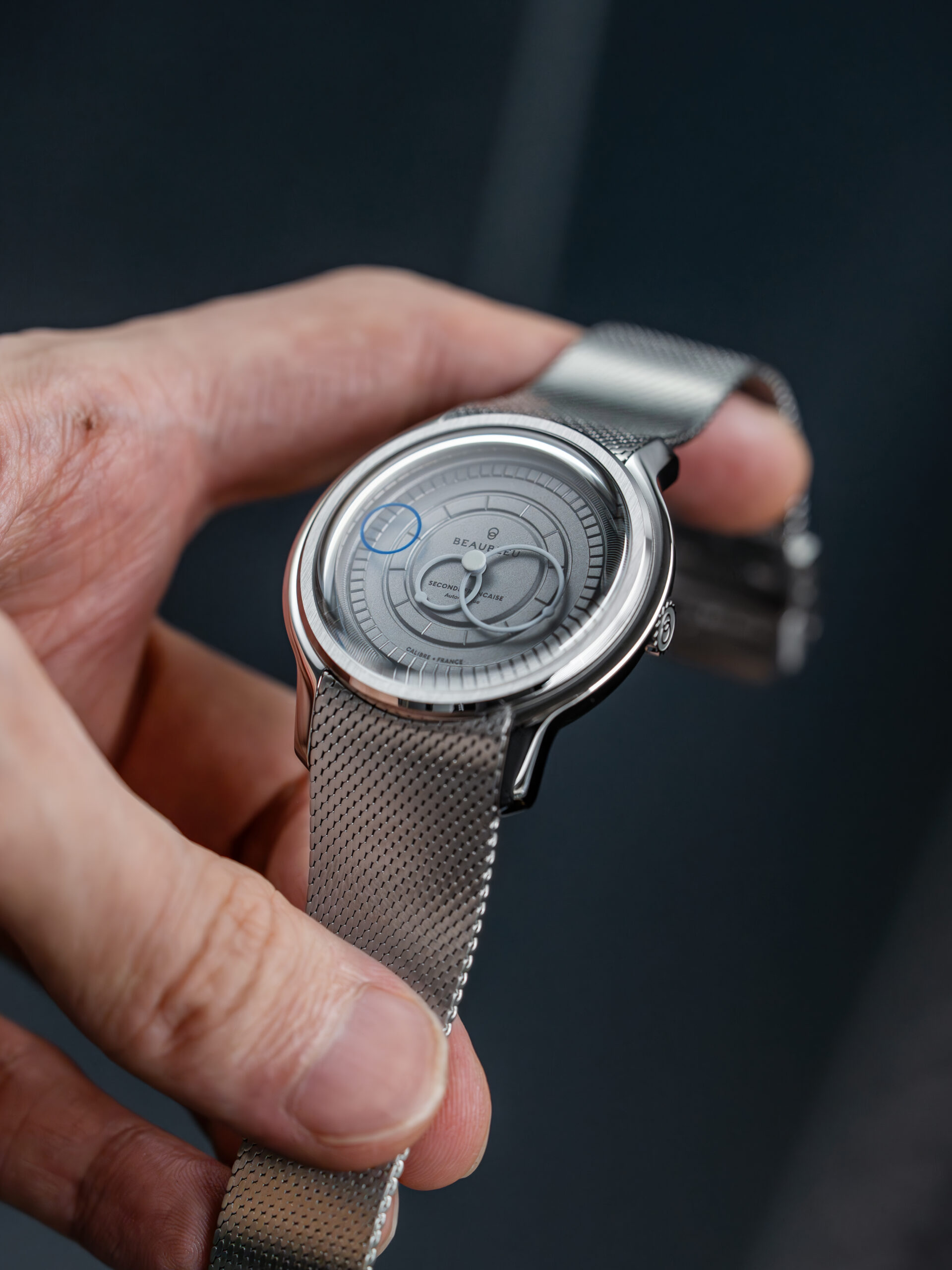 フープ状の秒針をガラス盤に貼り付け回転。そのエッジをボックス型サファイアのエッジで隠すことによって、まるで秒針が浮遊しているかのように演出しています。
