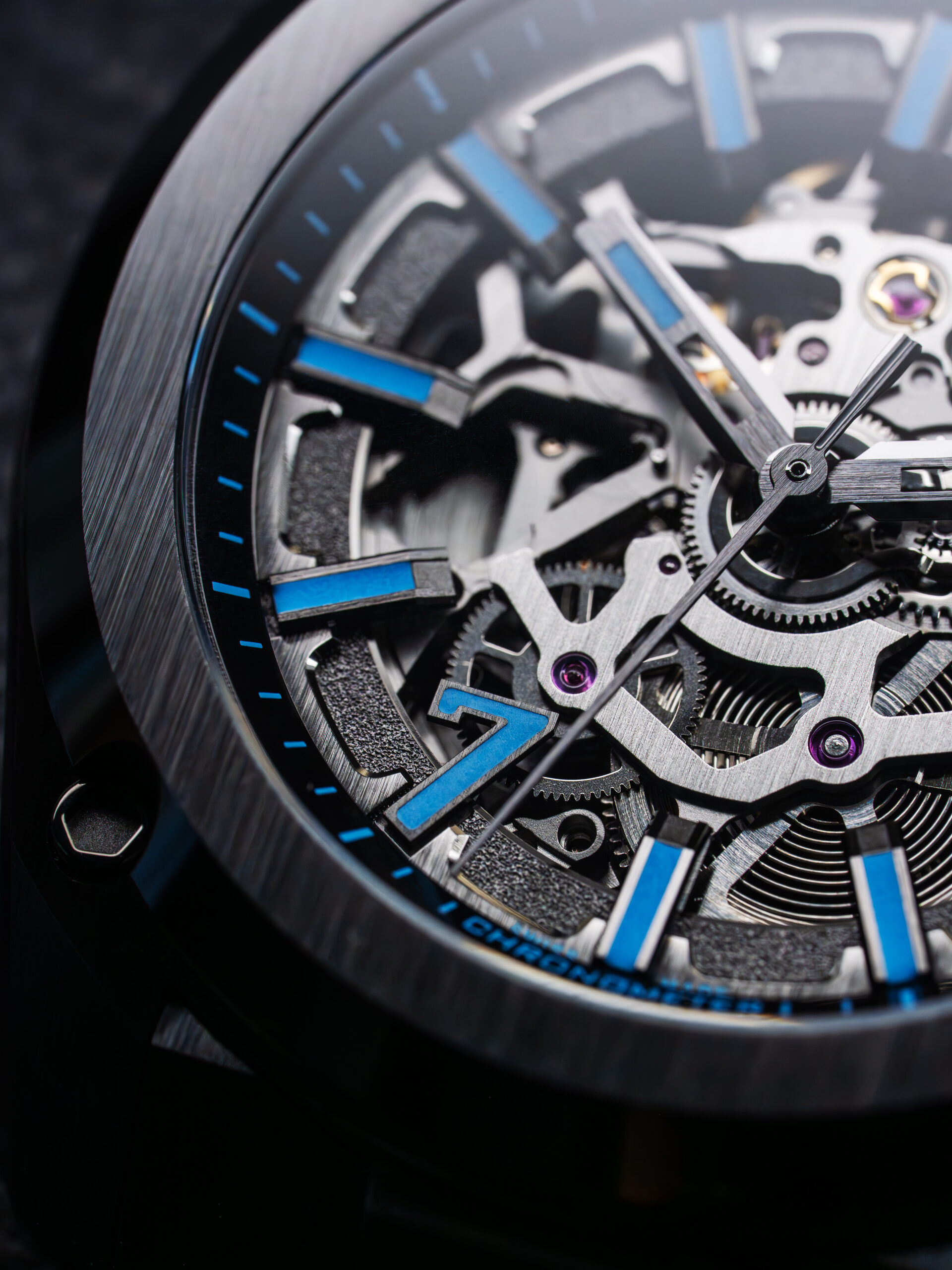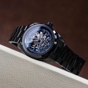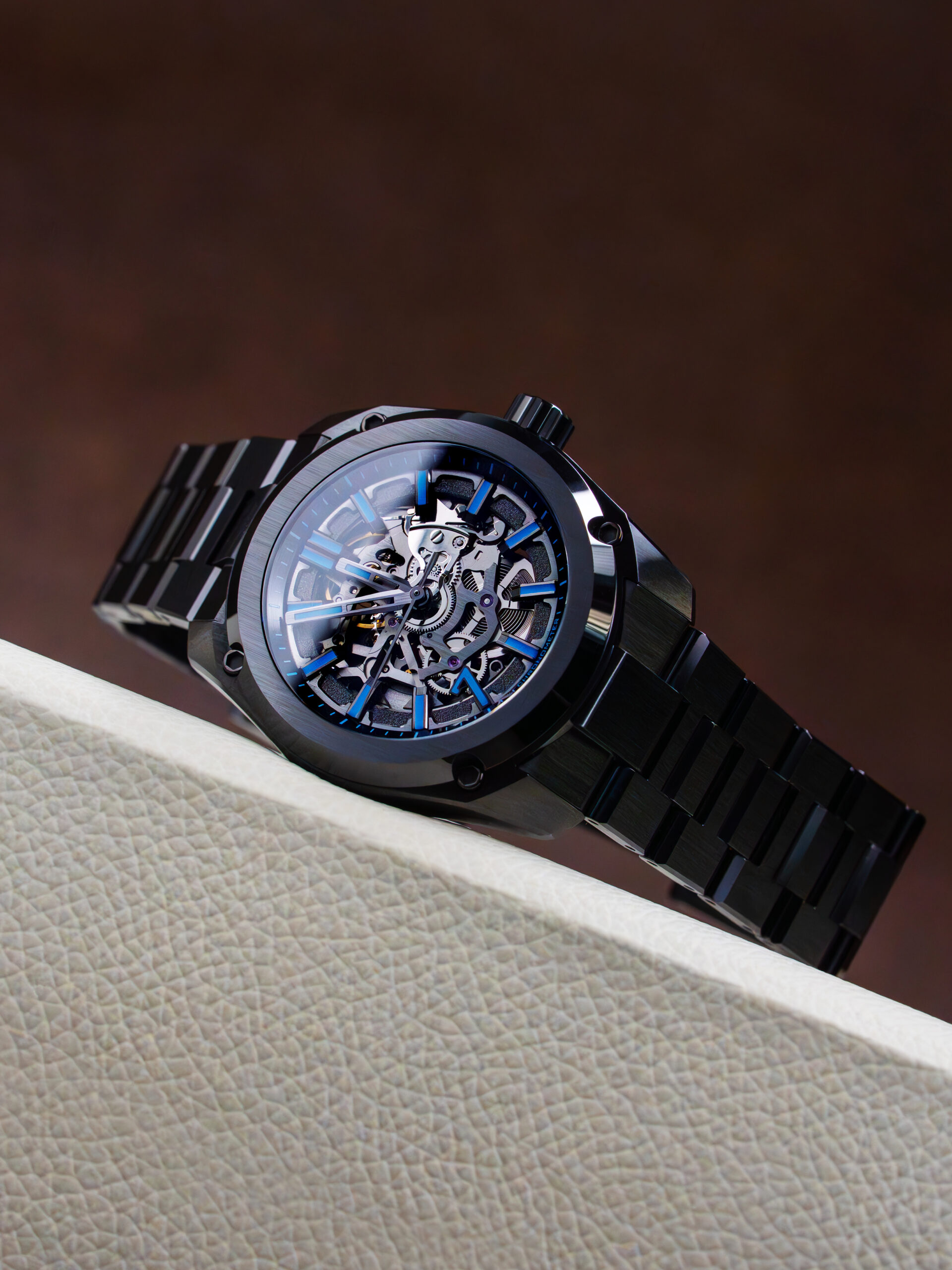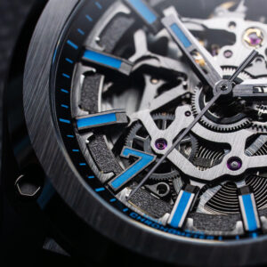 インデックスや針の夜光、インナーリングなど、Skeleton GTをベースにブラックとブルーの2色に絞った配色は本作のみの限定カラーとなります。